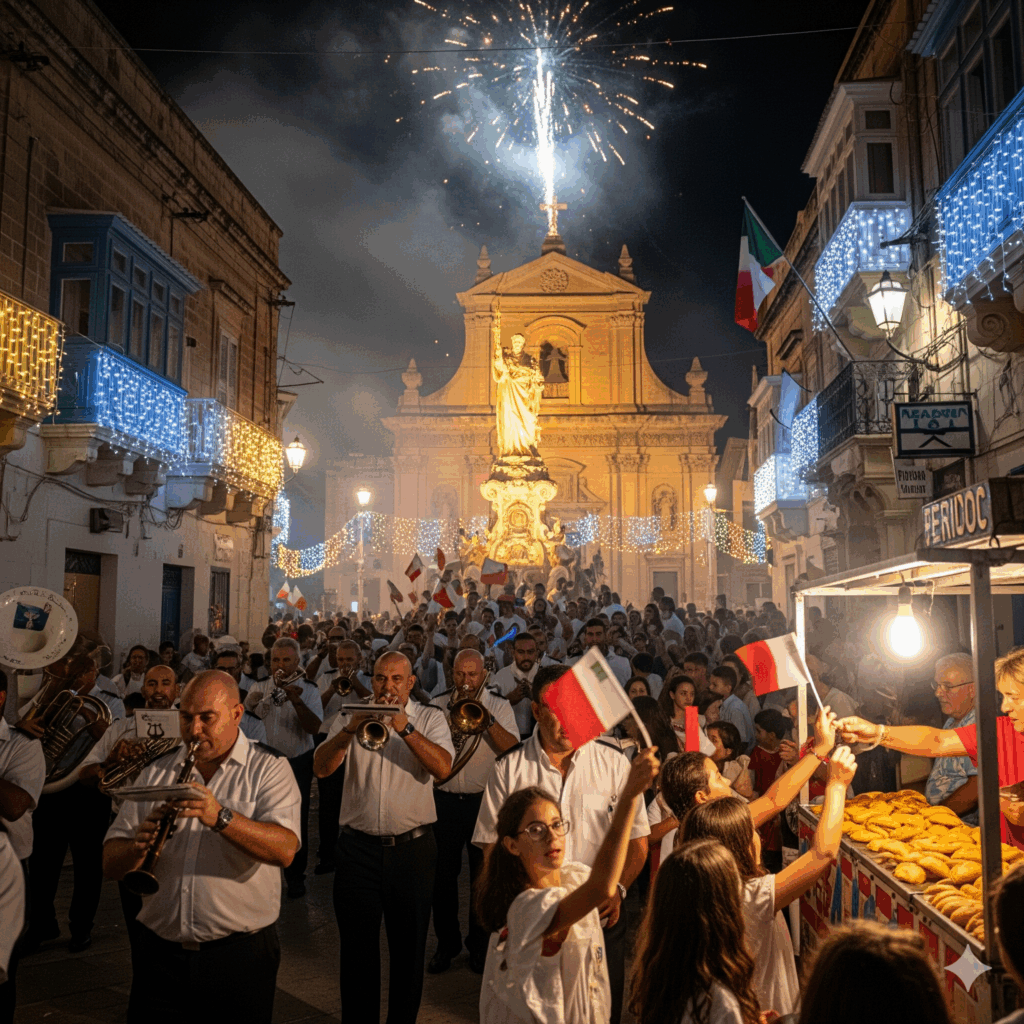 As evening falls, the streets, draped in damask and strung with intricate light displays (luminaria), come alive with the joyful music of local marching bands. The air fills with the scent of traditional nougat (qubbajt) from street stalls and the booming sound of fireworks, a key feature of every festa.