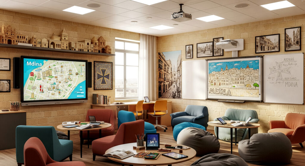 However, the true gem of our school is undoubtedly our spacious and sun-drenched rooftop garden. This expansive outdoor space is a beloved oasis where students gather to relax, enjoy their lunch with stunning views, and forge new friendships under the Maltese sky. It’s the perfect spot to recharge between classes.